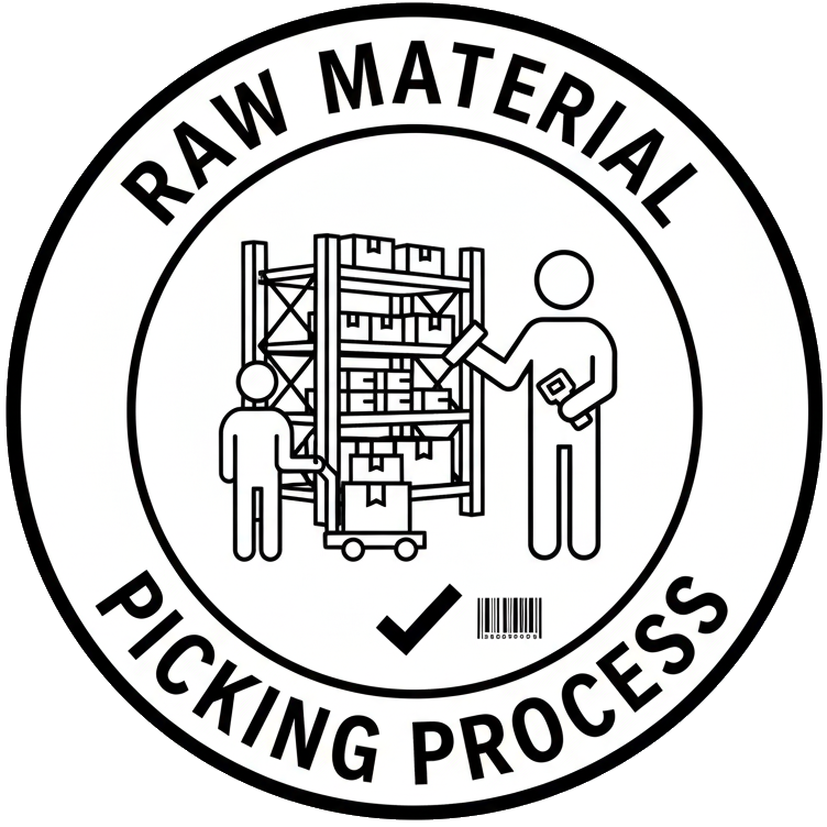 The raw material picking process is the activity of selecting and collecting the correct raw materia