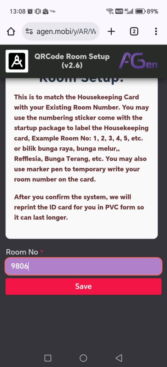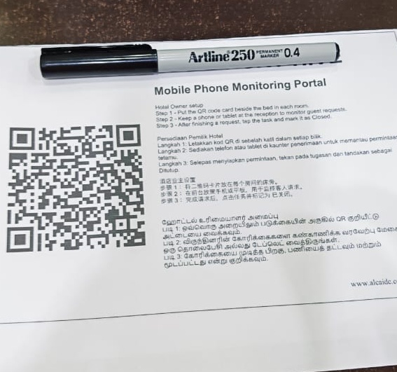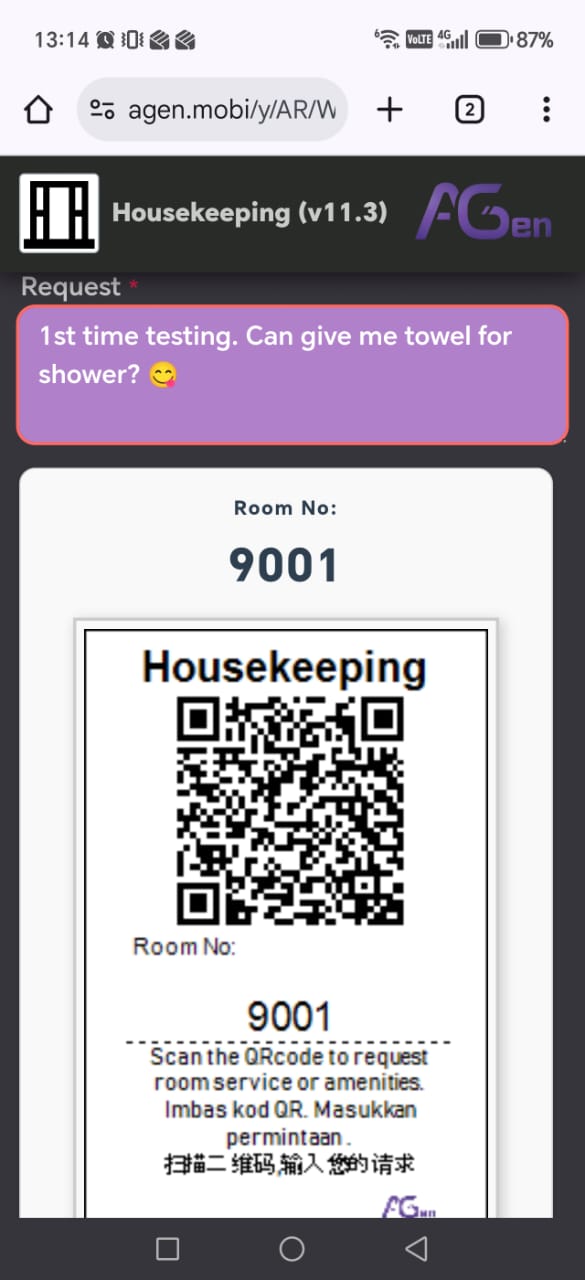 To setup this simple to use solution, below is the step by step procedure.Step 1 - Label room number for your Room TagYou may use marker pen to write the room number on the Room Tag.Step 2 - Scan the Room Tag QRcode 1 by 1 to setup the room number in AGen portal.You will need to key in your room number into the portal so you can know which room is requesting housekeeping service.Step 3 - Sample record entry into the portal.After setup the room number for the first time, Now you can try to key in the request for the first time.Step 4 - Monitor housekeeping record using mobile phoneFor continuous monitor the housekeeping records, you need to invest into 1 mobile phone (2nd hand will do) to alert the reception on the room housekeeping paging.Nortern Support: (604) 262 1650 Cik AfiqahCenter Support: (603) 62801650 Cik SharonSourtern Support: (607) 5591650 Cik Nora